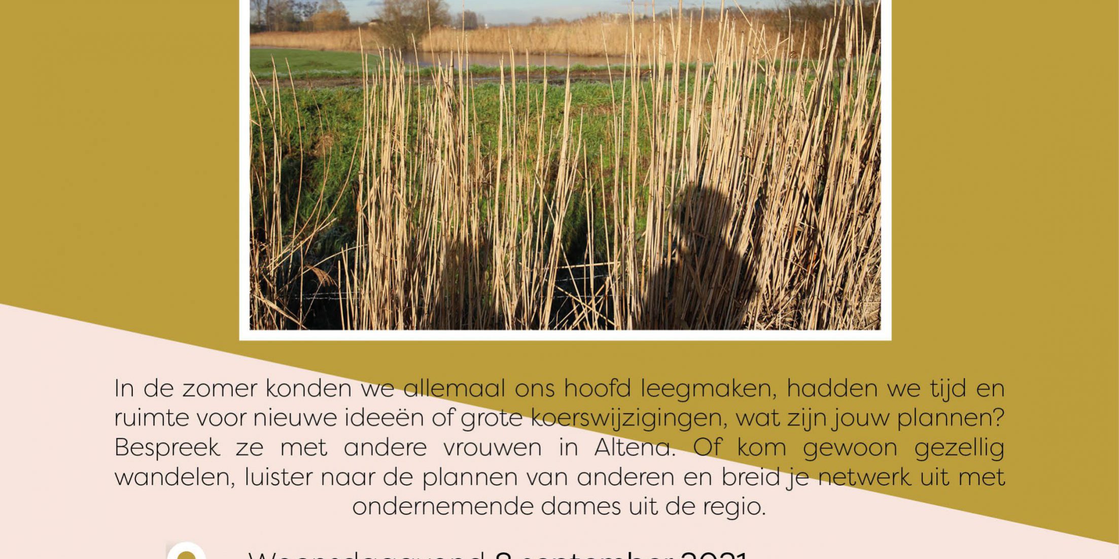 Ben jij een vrouw en werk je bijvoorbeeld in de politiek, binnen een bestuur, heb je een eigen bedrijf of ben je gewoon ontzettend ondernemend? Dan is dit iets voor jou! Op 8 september wandelen we namelijk met Vrouw en Altena. In de zomer konden we allemaal ons hoofd leegmaken, hadden we tijd en ruimte voor nieuwe ideeën of grote koerswijzigingen, wat zijn jouw plannen? Bespreek ze met andere vrouwen in Altena. Of kom gewoon gezellig wandelen, luister naar de plannen van anderen en breid je netwerk uit met ondernemende dames uit de regio.